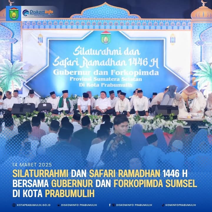 Sriwijaya Nusantara Com (MSN) Prabumulih. Kota Prabumulih menjadi tuan rumah dalam acara silaturrahmi dan Safari Ramadhan 1446 H yang dihadiri oleh Gubernur Sumatera Selatan, H. Herman Deru, SH., MM bersama dengan Forum Komunikasi Pimpinan Daerah (Forkopimda) Sumatera Selatan.Acara yang berlangsung di Pendopoan Rumah Dinas Kota Prabumulih diwarnai dengan kegiatan buka puasa bersama yang penuh kebersamaan dan kekhidmatan.jumat 14/03/2025