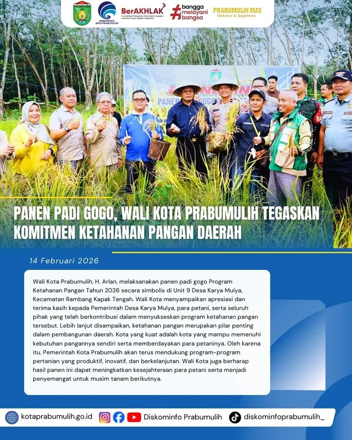 Sriwijaya Nusantara Com (MSN) Prabumulih. Wali Kota Prabumulih, H. Arlan, melaksanakan panen padi gogo Program Ketahanan Pangan Tahun 2026 secara simbolis di Unit 9 Desa Karya Mulya, Kecamatan Rambang Kapak Tengah.14/02/20226